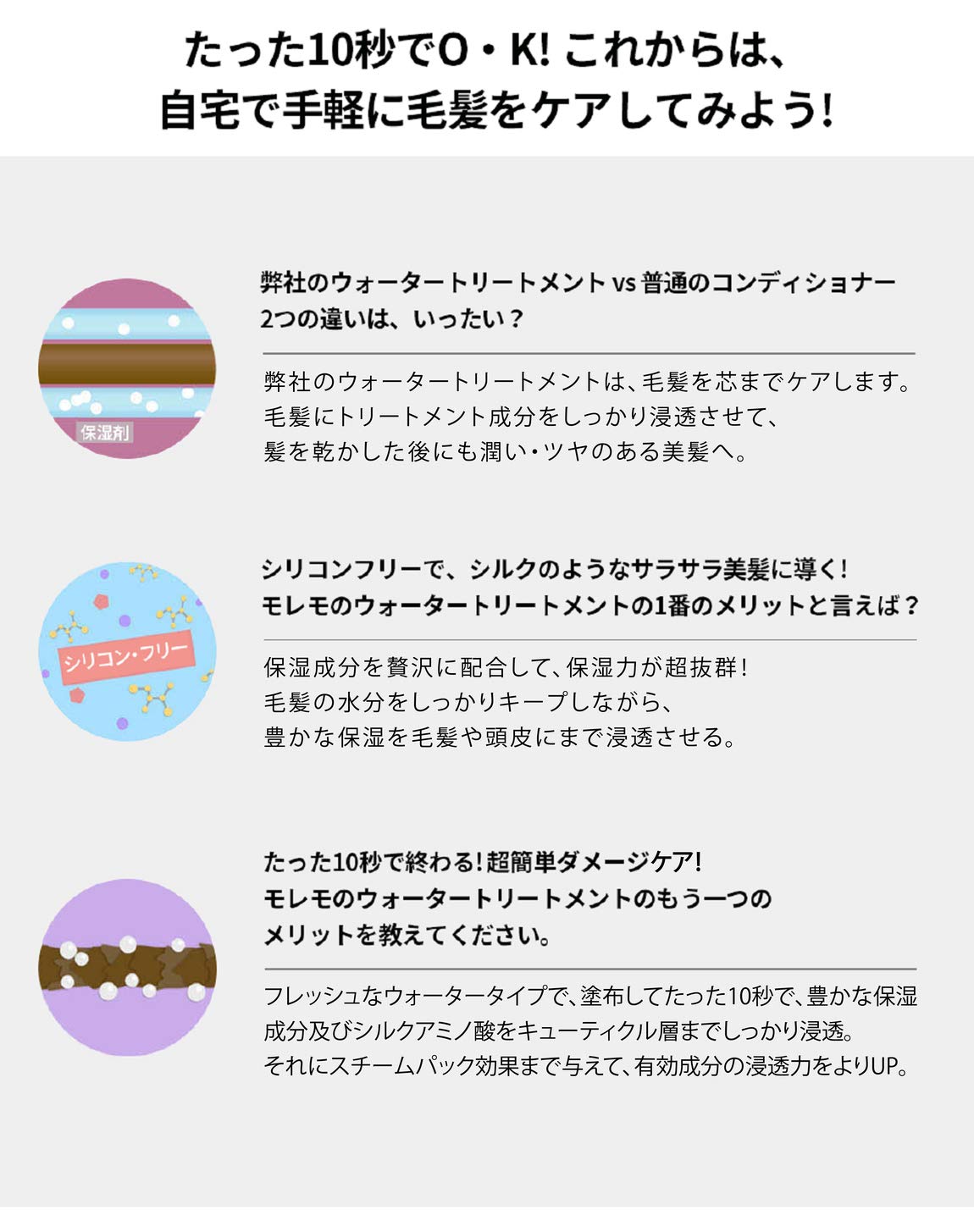 Moremo Water Treatment Miracle 10 is a liquid hair treatment that gives intense moisture to damaged hair from the moment it is applied. Formulated with SR- 21 COMPLEX: 3 types of Keratin and 17 Amino Acids. Providing hair that is over processed, damaged, dry an abundance of shine and hydration for a silkier smoother voluminous look.