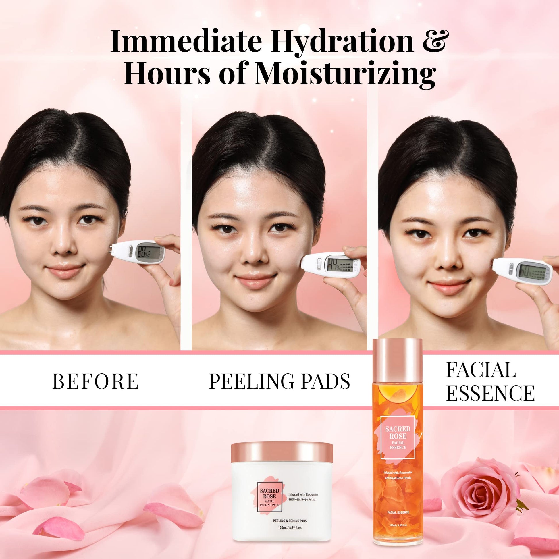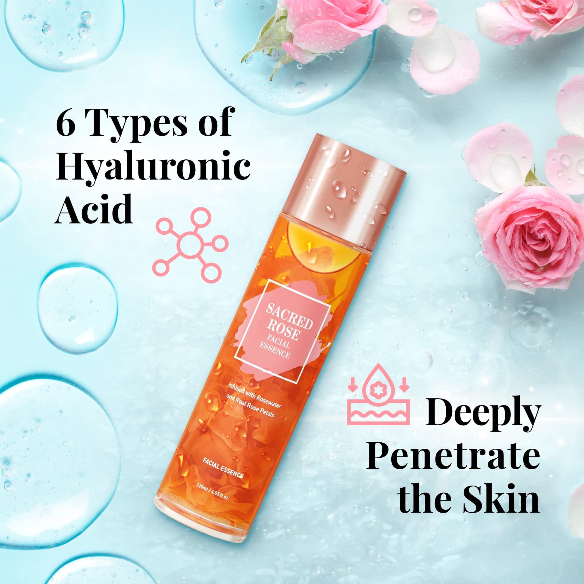 - KOREAN SKIN CARE DEEP HYDRATION: Facial toner infused with 100% Rose Water, Rose Petals, Rose Extracts, and oils from each part of the Rose Plant, Rose Stem cells, and Rose Placenta, this Rose Facial Essence combines 6 kinds of Hyaluronic Acid and NMF (Natural Moisturizing Factor) to quickly hydrate, increase suppleness, smooth fine lines, and brighten skin. Great for all skin types.