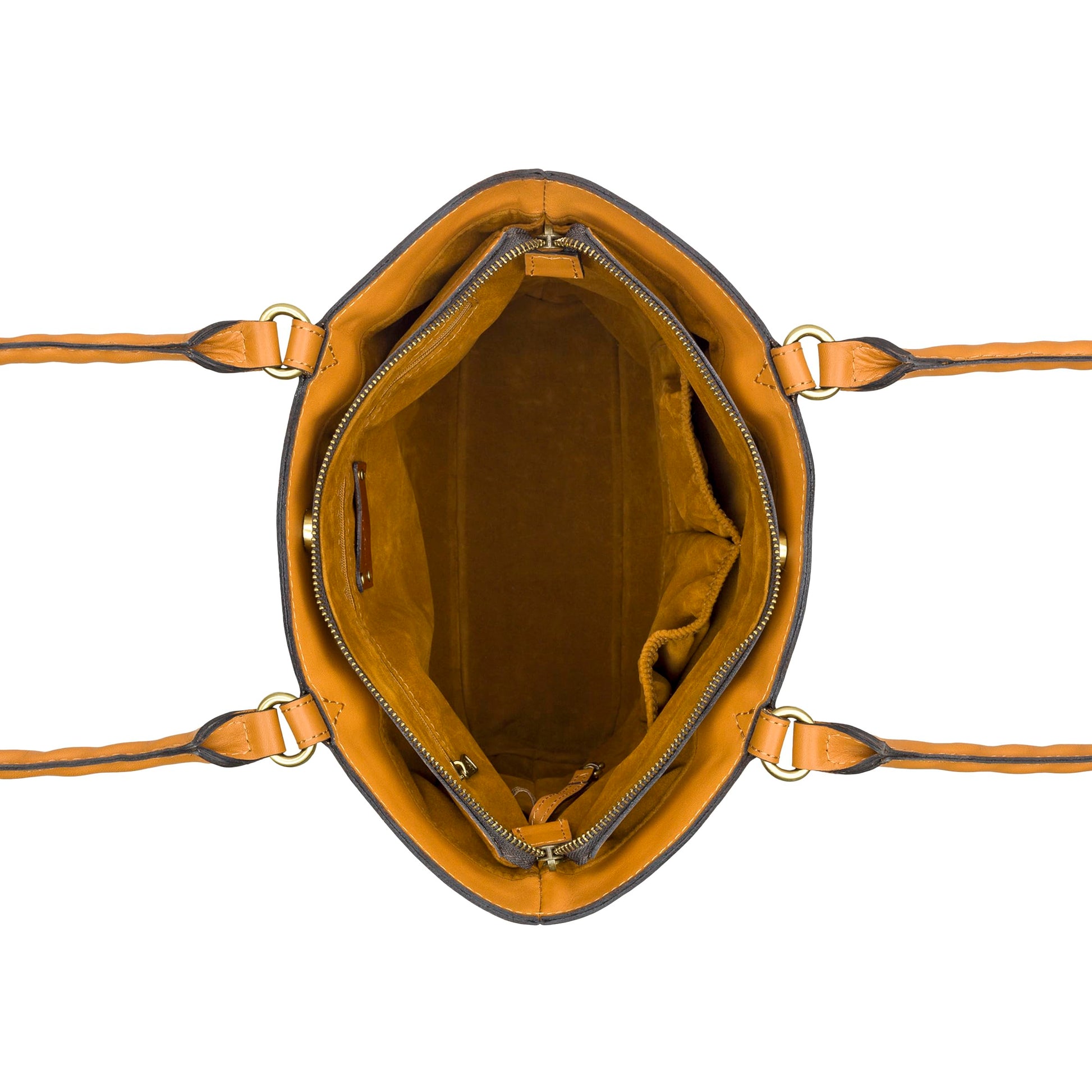 - 100% full-grain leather|Interior: 1 center zip pocket with 1 zip pocket 2 slip pockets; faux suede lining 100% polyester|Exterior: 1 rear zip pocket protective metal feet burned edge finish|Zipper closure/magnetic snap closure|Signature brushed brass hardware heavy handcrafted stitching|Dimensions: 14"(W) at top 11 1/2"(W) at bottom x 11 1/4"(H) x 4 1/2"(D)|Handle drop: 10 1/2"