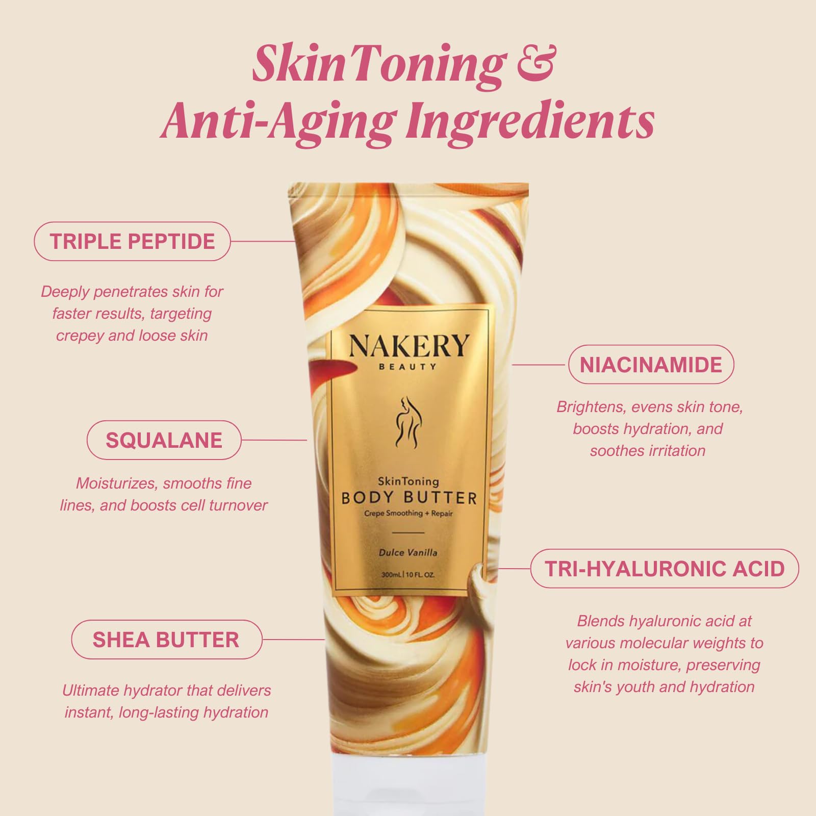 - VISIBLY & INSTANTLY TIGHTENS & FIRMS CREPEY SKIN - Nakery Beauty’s Serum-Infused Moisturizing Cream is designed to smooth, tighten, & firm your skin from neck to toe instantly. This skin moisturizer & firming cream visibly reduces the appearance of crepey & loose, sagging skin, giving you healthier, younger-looking skin!