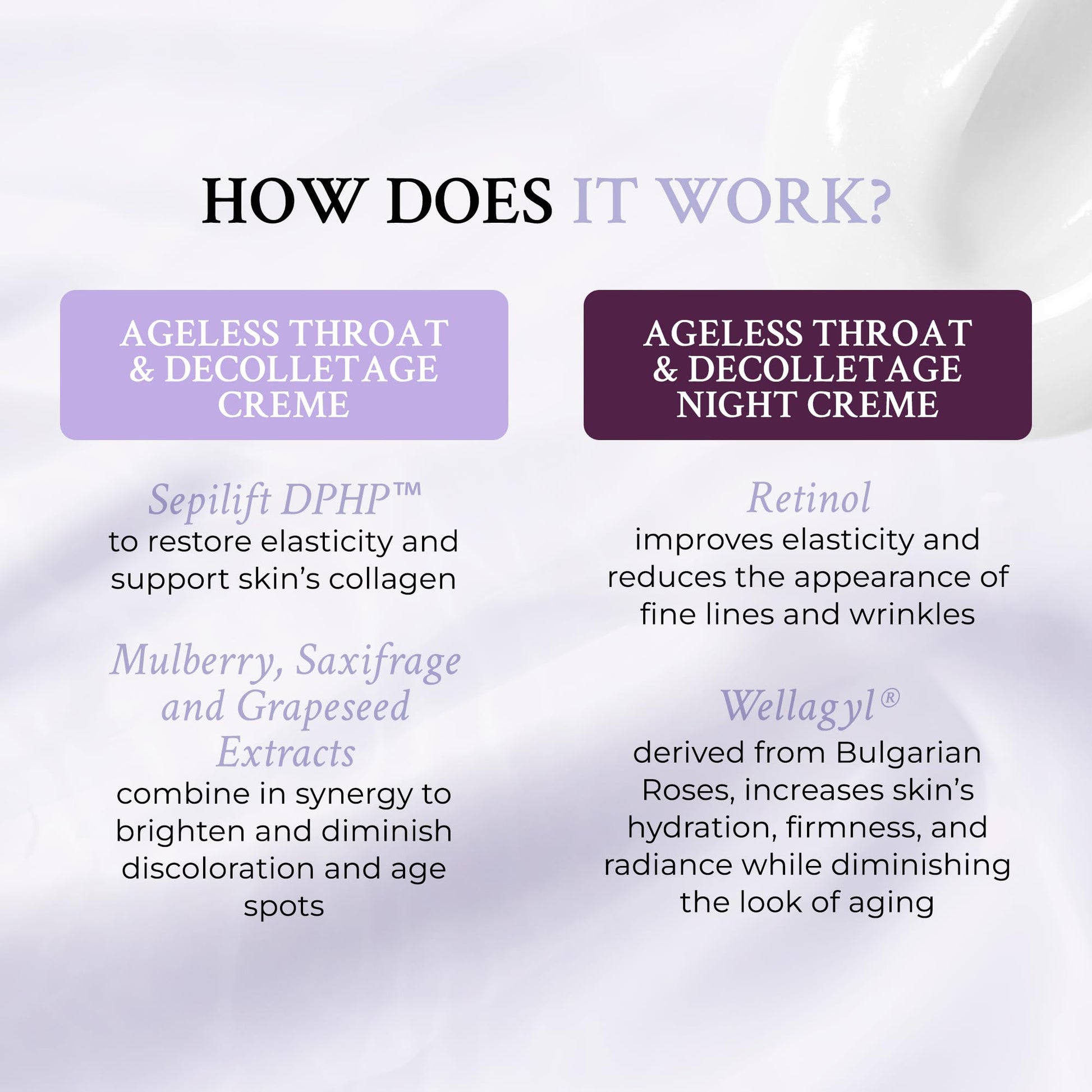 - ๐ Sepilift Technology: Our cutting-edge Sepilift technology is the backbone of our Ageless Throat & Decolletage Creme. This innovative ingredient works synergistically to provide a remarkable lifting effect, ensuring that your skin feels and looks visibly tighter.