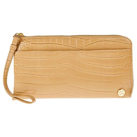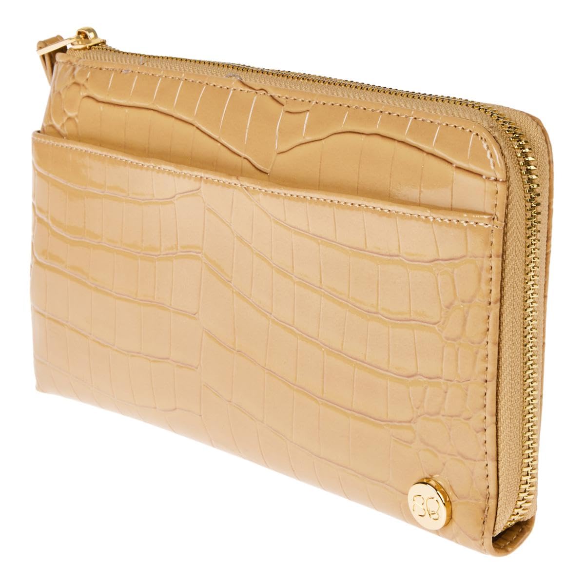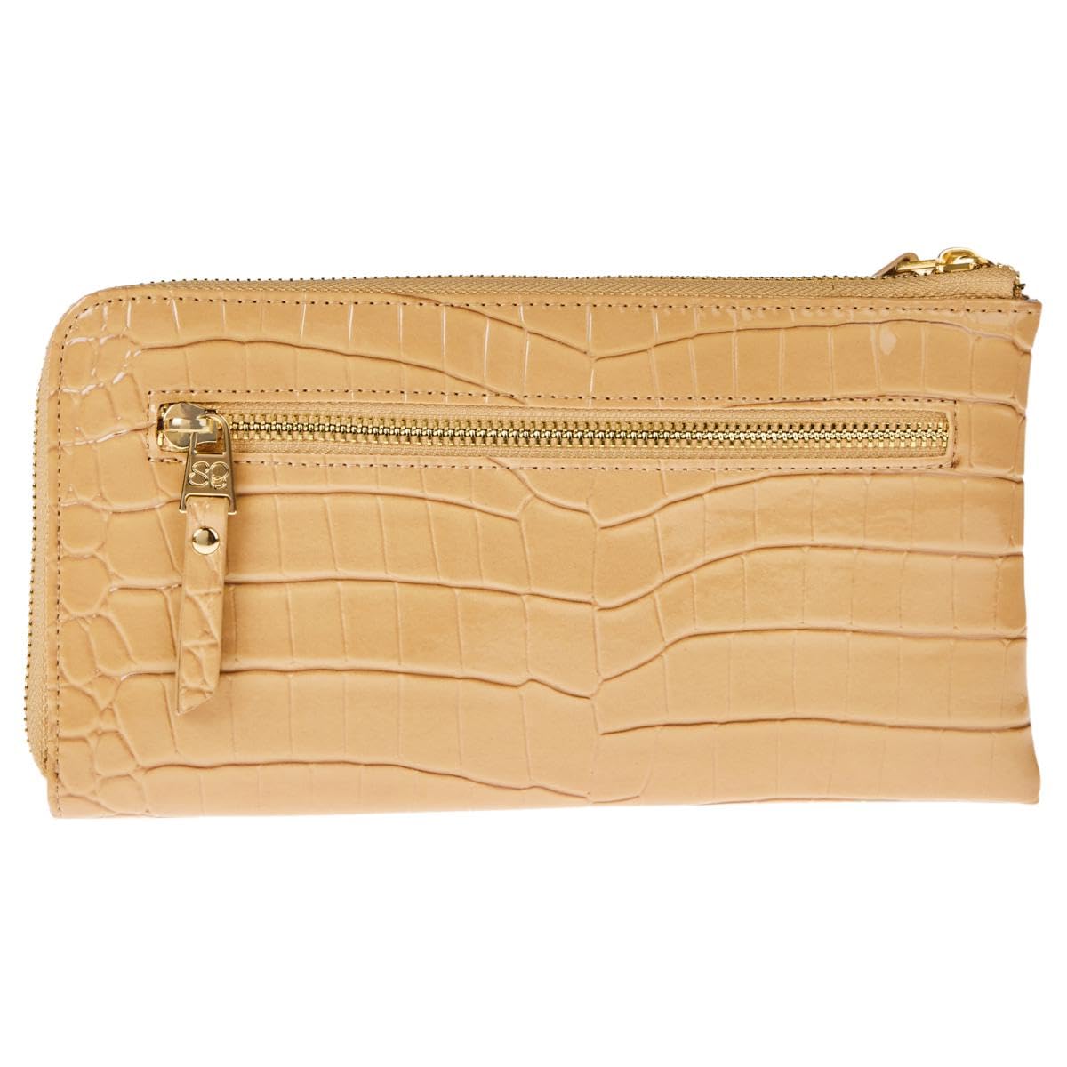 - More Features RFID protection Durable Croco !00% Polyurethane Top zipper with (SB)Samantha Brown puller attached to a wristlet strap Front features a SB round logo plaque Front features a full-length slip pocket Exterior rear includes a zip coin pocket Hardware: Shiny Gold