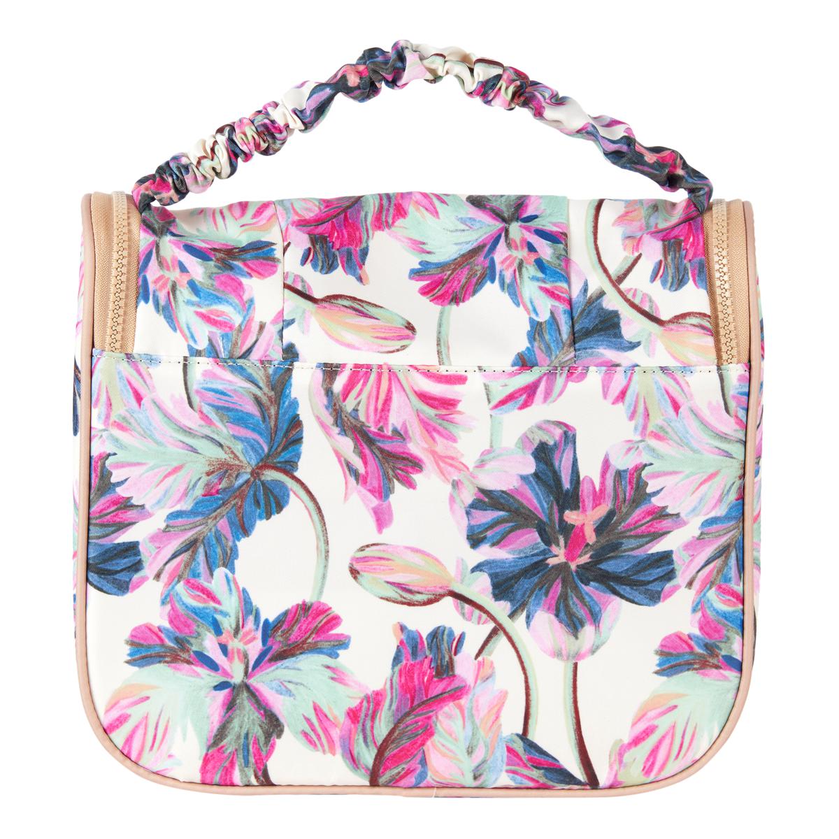 - Top rouched handle Lightweight and durable polyester Features a hook that allows you to hang your toiletry bag on any hook, door rod, etc. The hook folds down when put away. Closure: Double reliable chunky zip-around zipper with SB metal logo. The zipper closure secures contain & protects the contents. The front features a Samantha Brown round logo plaque