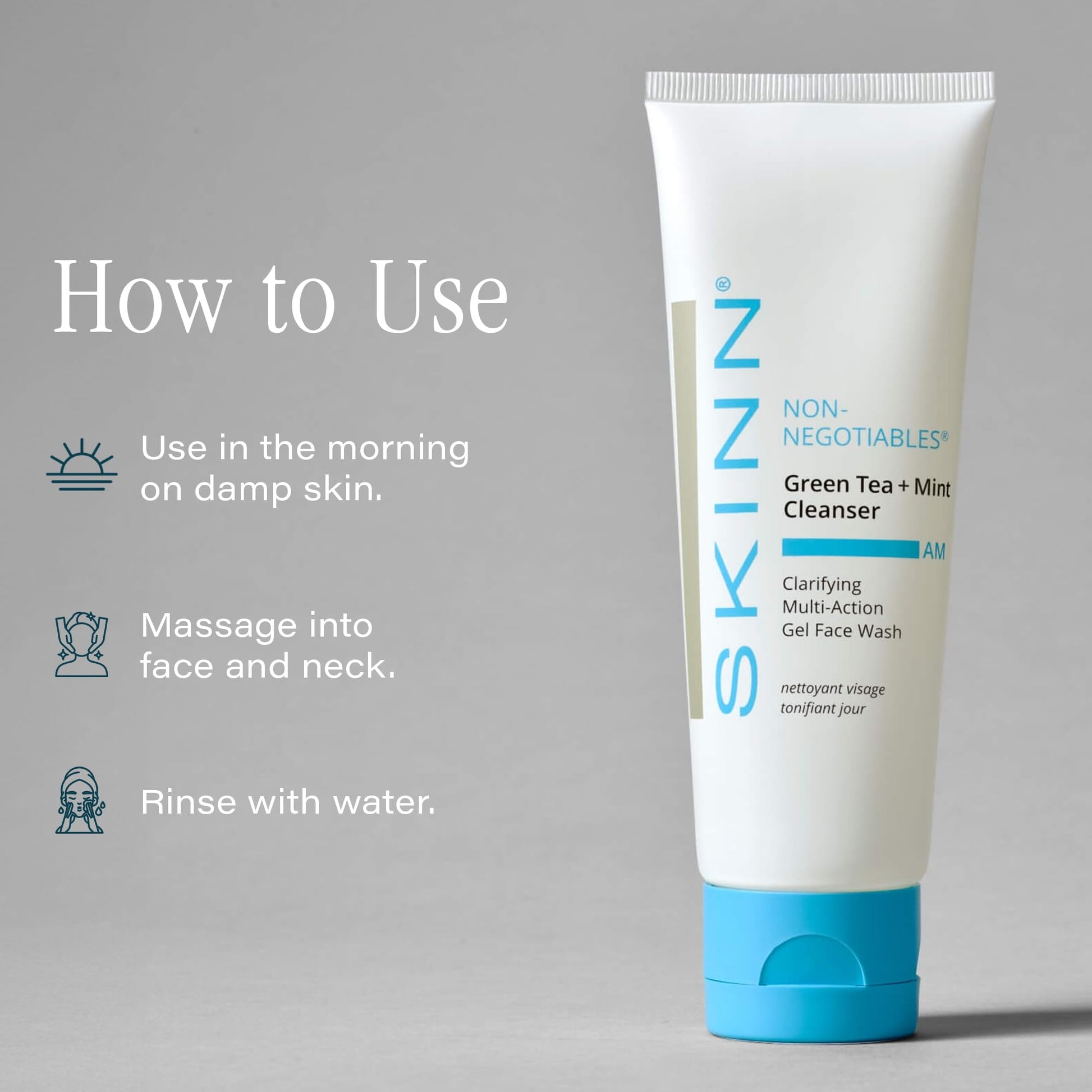 - Upgrade Your Daily Routine: Use at night on damp skin. Massage into face and neck for one minute with circular motions. Rinse with water or leave on for 5-10 minutes for a deep cleansing mask. Pair this PM cleanser with the Non-Negotiables Green Tea + Mint AM Cleanser for an optimally balanced cleansing solution that takes you from day to night.