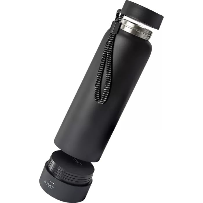 TYLT Power Bottle 2.0 24oz Stainless Steel Wide Mouth Water Bottle Removable 5700mAh Magnetic Portable Power Bank Dishwasher Safe Cup Holder Compatible Lanyard Handle Black